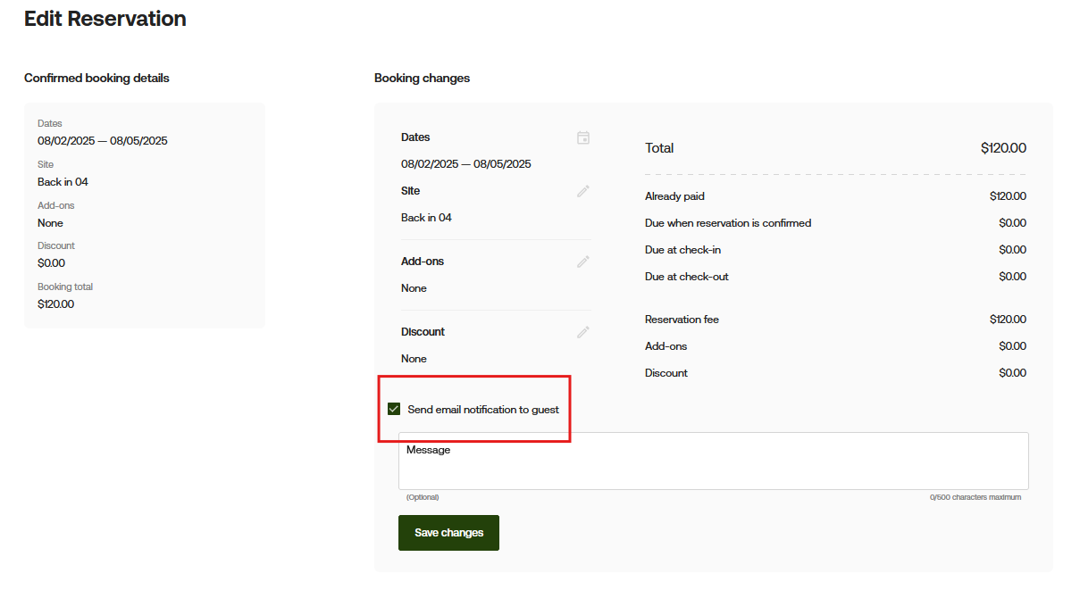 Here’s how you can prevent customers from receiving notifications: When making changes to a reservation, simply uncheck the "Send email notification to guest" box. This will prevent the customer from being notified about the changes you’re currently making.
