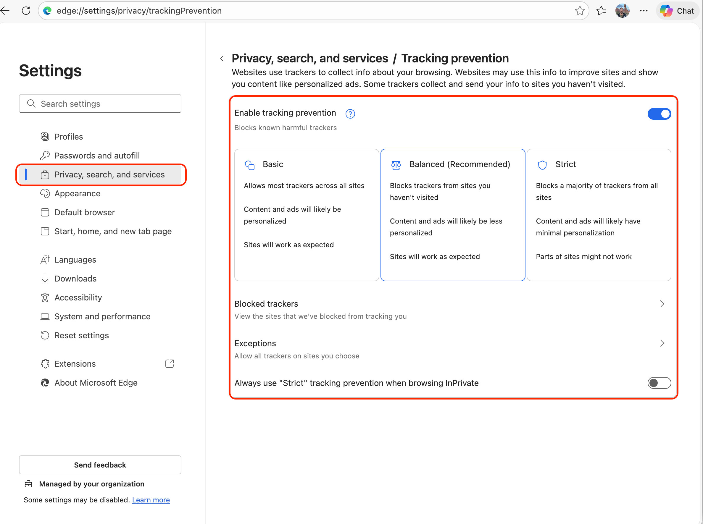 - Under Tracking prevention, confirm the setting is Balanced.
