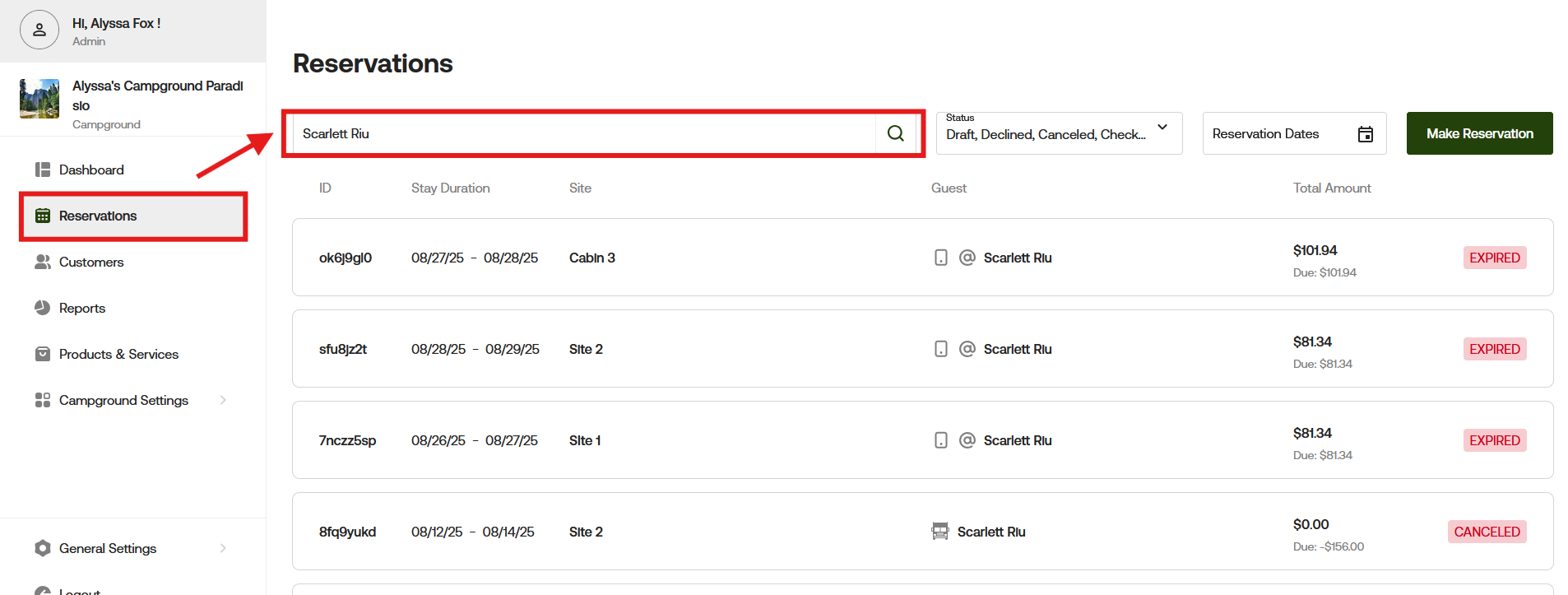 Select the Reservations tab, click into the search bar, and enter the customer's name or email. All related reservations will populate.