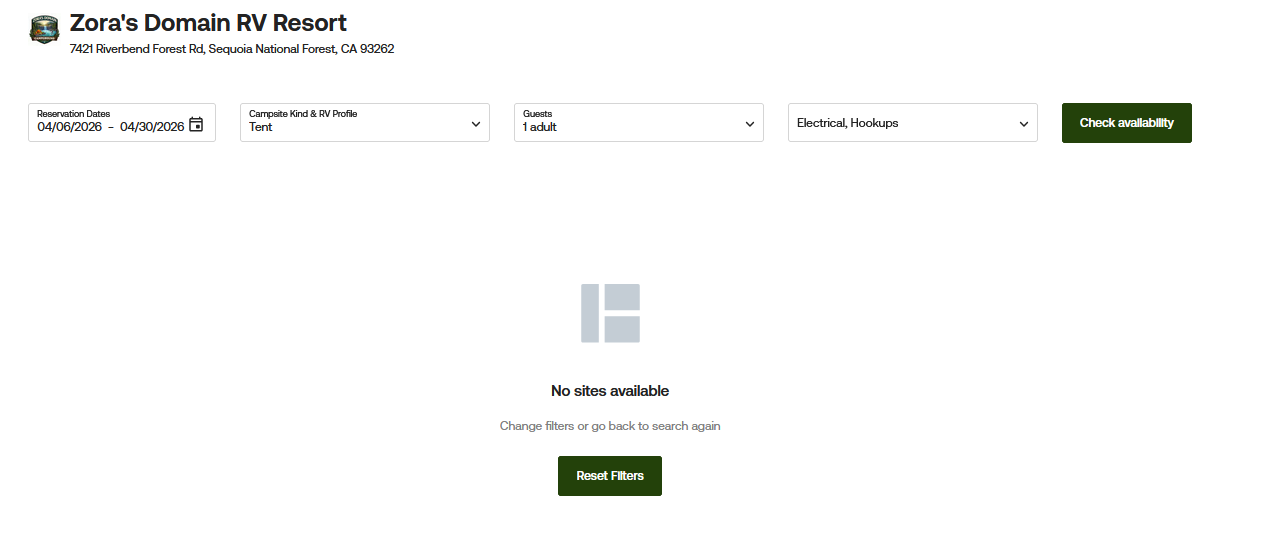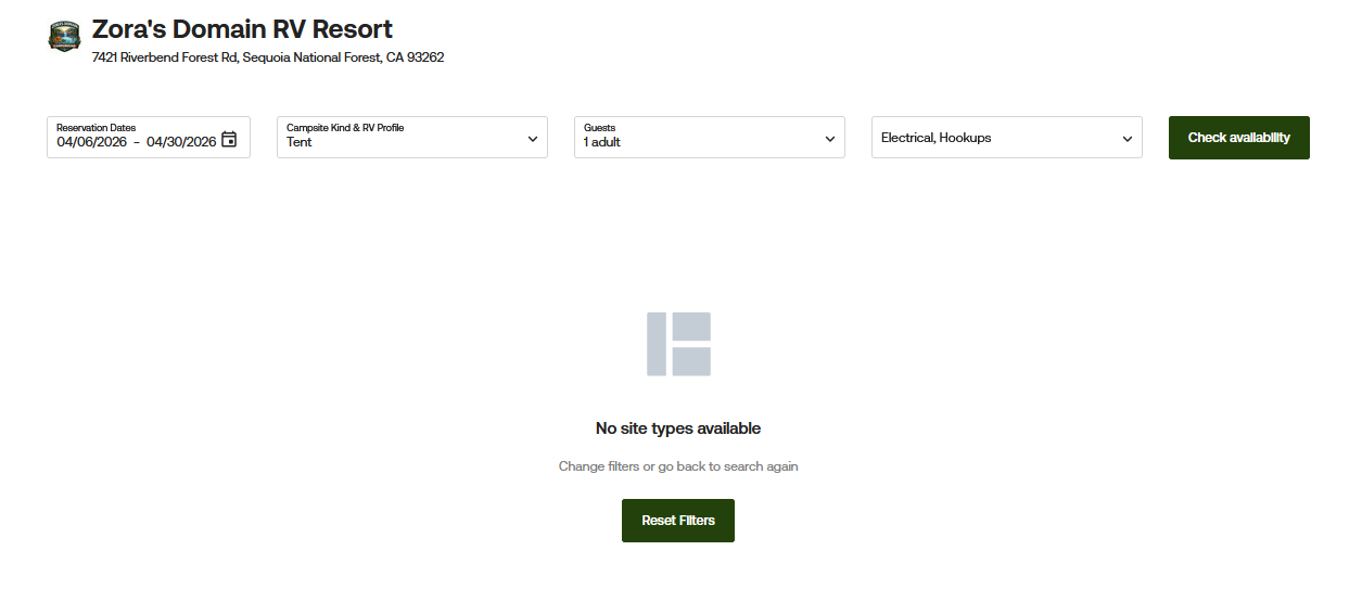In this example, the guest selected dates from 04/06/2026 to 04/30/2026, which is longer than the 14-night limit set in the reservation settings. Because of that, the system does not return any available site types and instead shows the message “No site types available.”