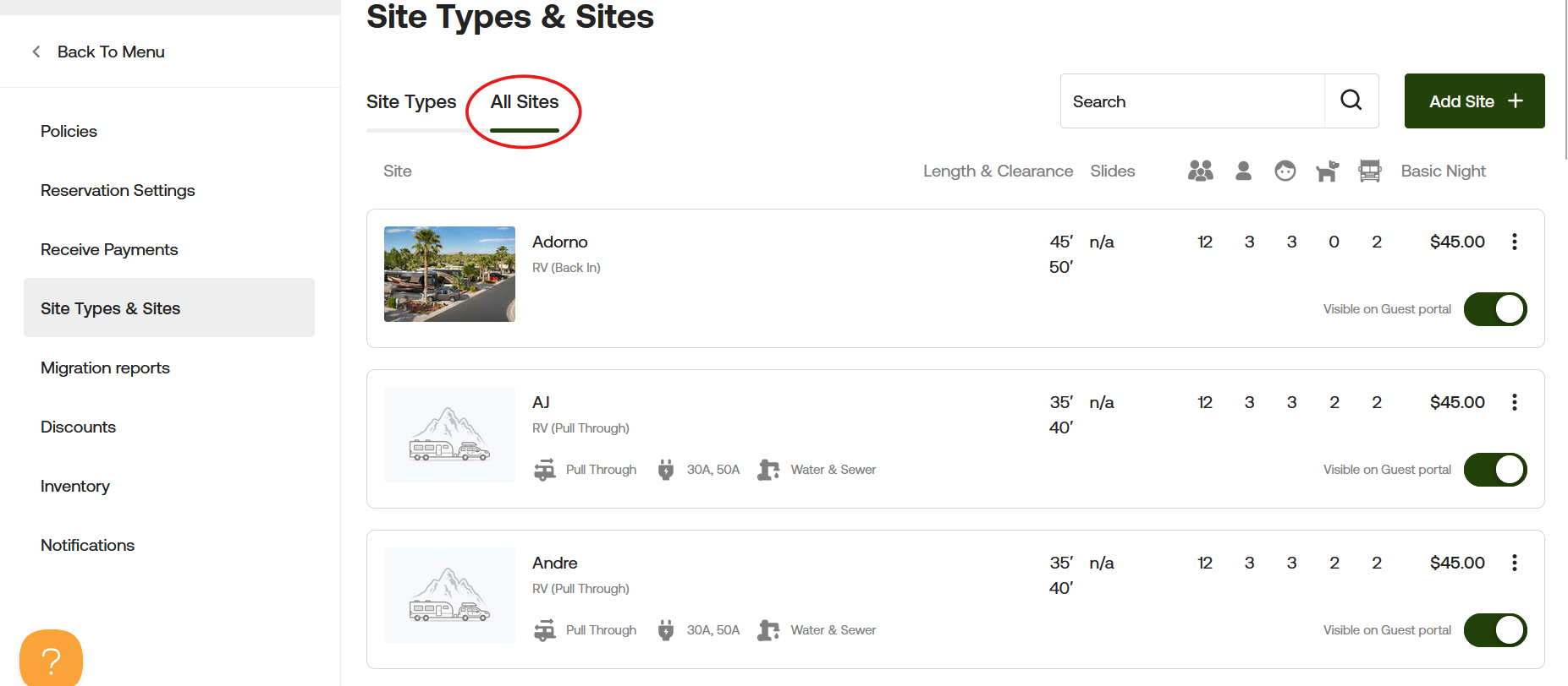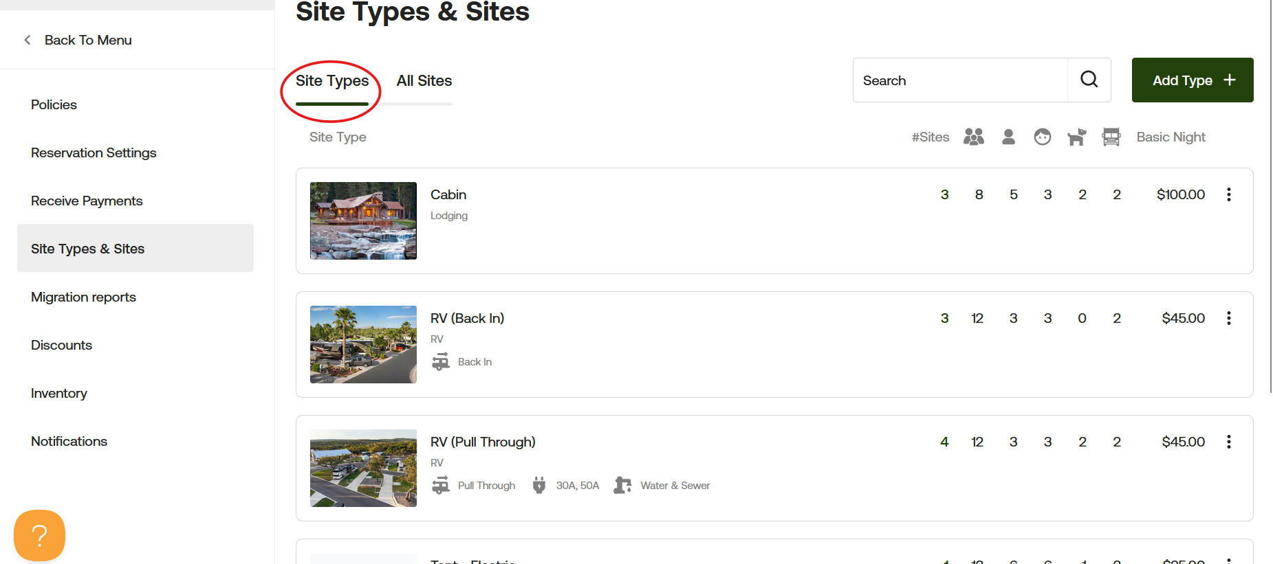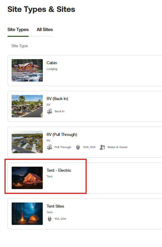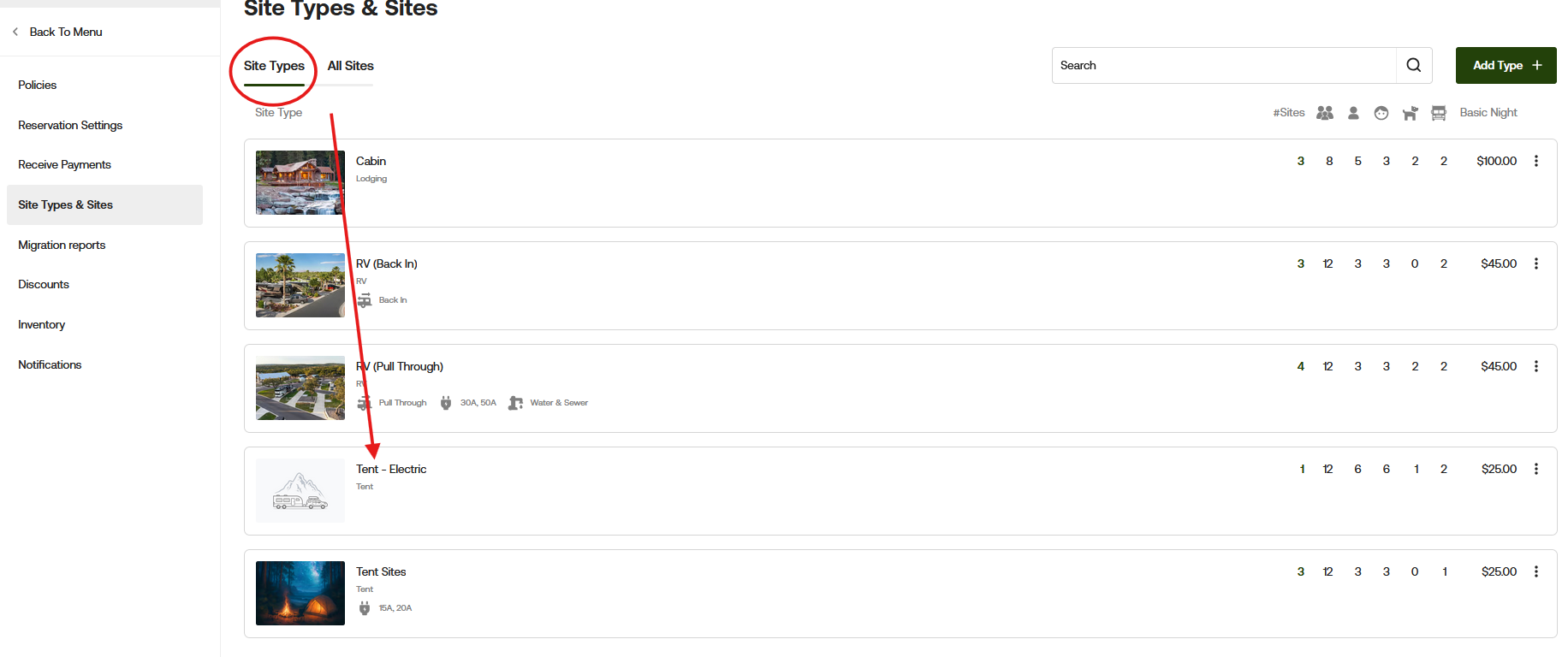 Start by going to Campground Settings, then select "Site Types & Sites."