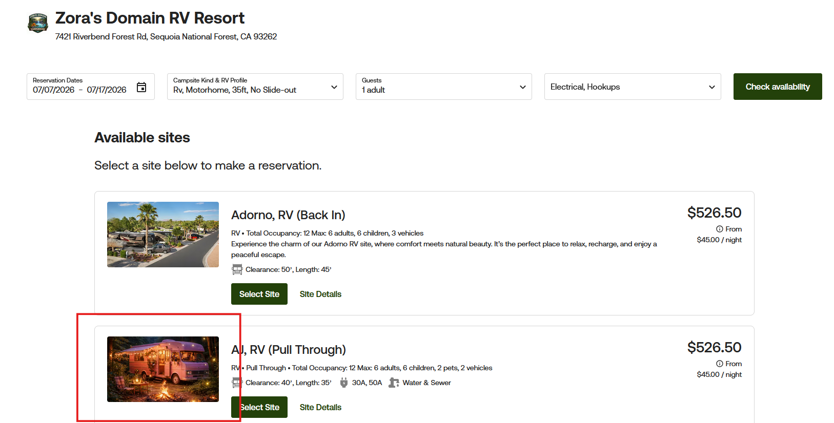 Here is what it will look like if your reservations are set to book by site and images have been uploaded: