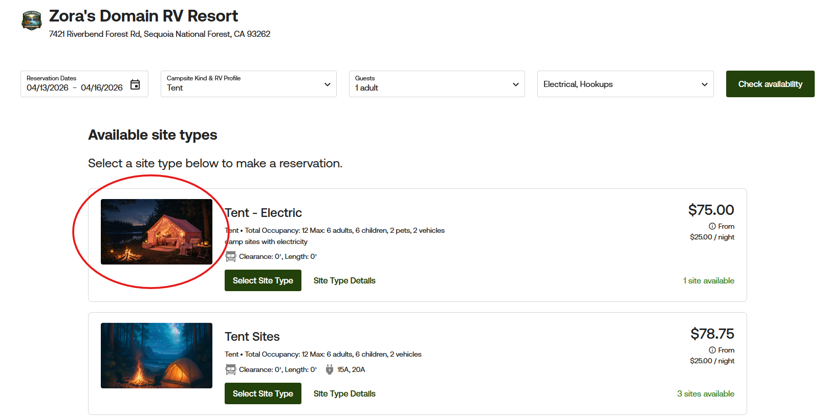 Here is what it will look like within the Guest Portal if your reservations are set to book by site type only.