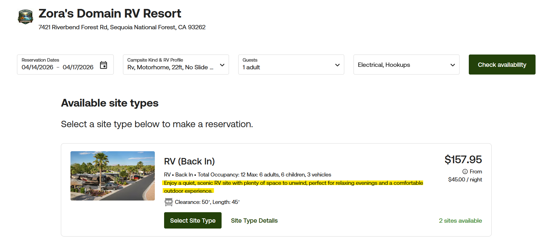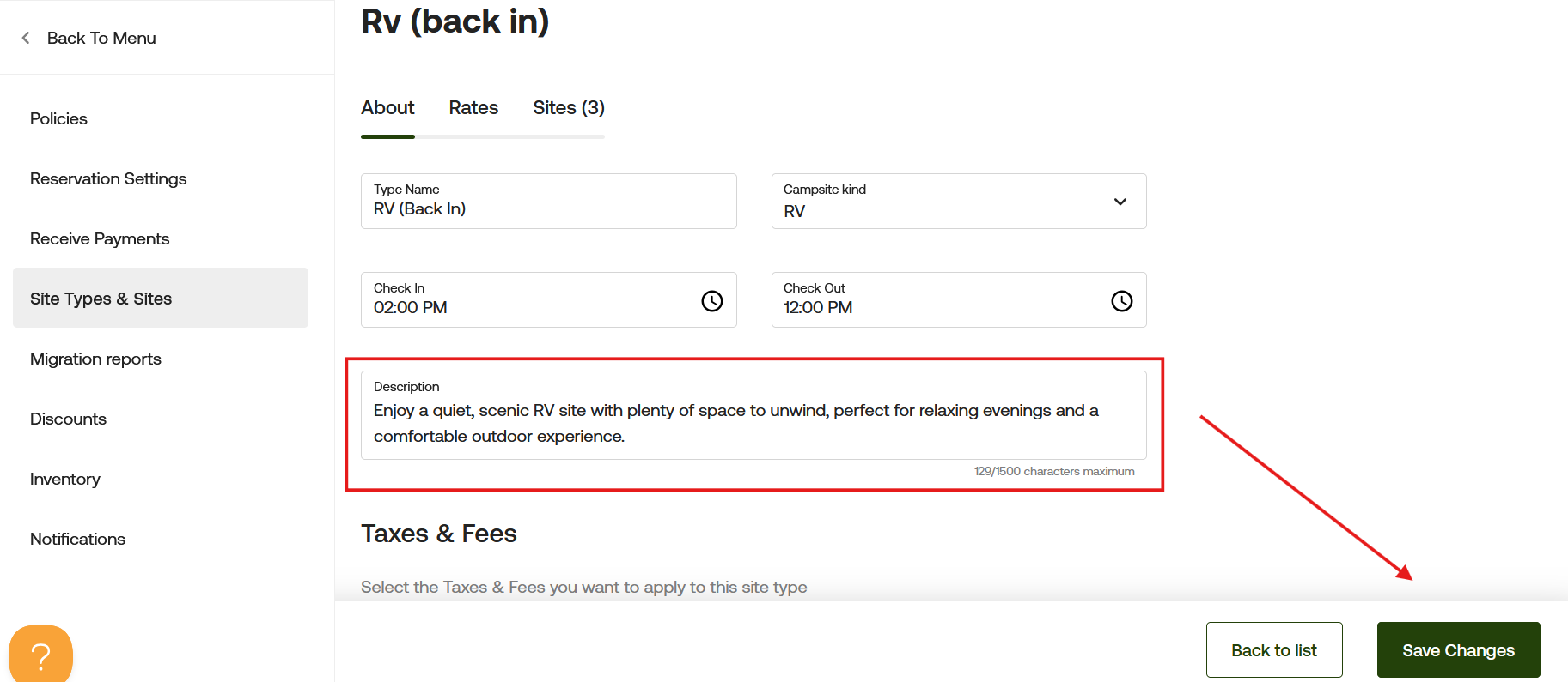 After double-clicking the site type you want to edit, you will be taken to the next page where you can update the description for the RV site type. Editing an individual site is a separate process. Click here to learn how to edit an individual site.